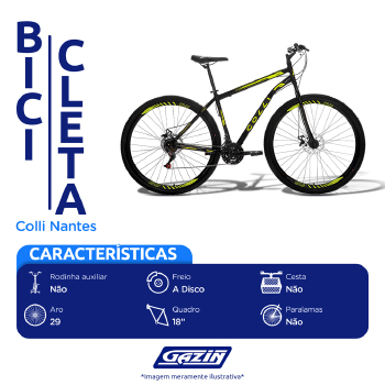 . Cor: PTO/AMARELO - Voltagem: SEM VOLTAGEM BIC. COLLI NANTES A.29 Q18 F.DISCO 21V ALAVANCAS: ALAVANCA RAPID FIRE 3/7V RODA: ARO 29 AERO 36 FUROS FREIO A DISCO CAMBIO DIANTEIRO 31.8 PUXA POR CIMA (PARA 42 DENDES) CAMBIO TRASEIRO C/ GANCHEIRA KIT FREIO A DISCO PINCA/DISCO MANOPLA DIPLOMATA MOVIMENTO CENTRAL 34.7MM COM COLAR CAIXA DE DIREÇÃO: MOVIMENTO DIRECAO COMUM COM COLAR PEDAL FREESTYLE 9/16 PEDIVELA TRIPLO ACO (24/34/42) PNEU 29X2.10 QUADROQUADRO 29 SNOW / ROMA / V40 / 29 SNOW / ROMA / V40 / SELIM COLLI C/ CARRINHO DIMENSÕES DO PRODUTO ALTURA: 112 CM LARGURA: 73 CM PROFUNDIDADE: 188 CM PESO: 17 KG