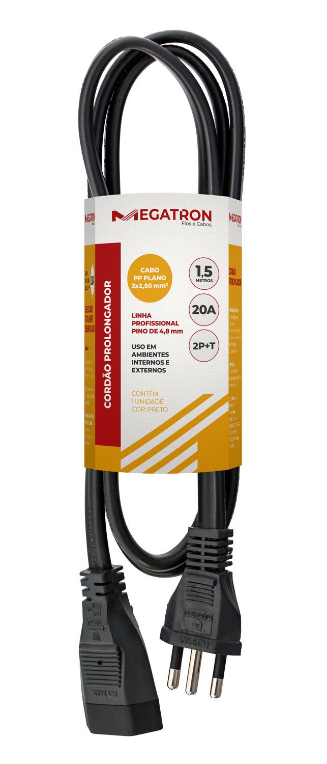 O Cordão Prolongador com Cabo PP 20A, com 1,50 metro de comprimento e condutores 3x2,50 mm², é ideal para quem precisa de alto desempenho, segurança e resistência