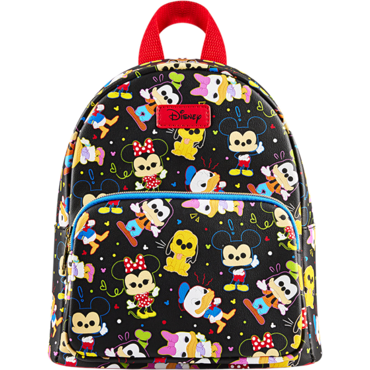 Mini mochila Mickey E Friends. Este design vibrante apresenta Mickey Mouse, Minnie Mouse, Pato Donald, Margarida, Pateta e Pluto em um estilo de arte adorável inspirado no Funko Pop! colecionáveis. Bolinhas multicoloridas e silhuetas do Mickey são salpicadas no fundo preto da bolsa, e detalhes rabiscados ajudam a destacar as emoções de cada personagem. Uma adição alegre a qualquer roupa, este acessório vibrante é perfeito para os fãs da Disney que procuram manter seus amigos favoritos por perto.