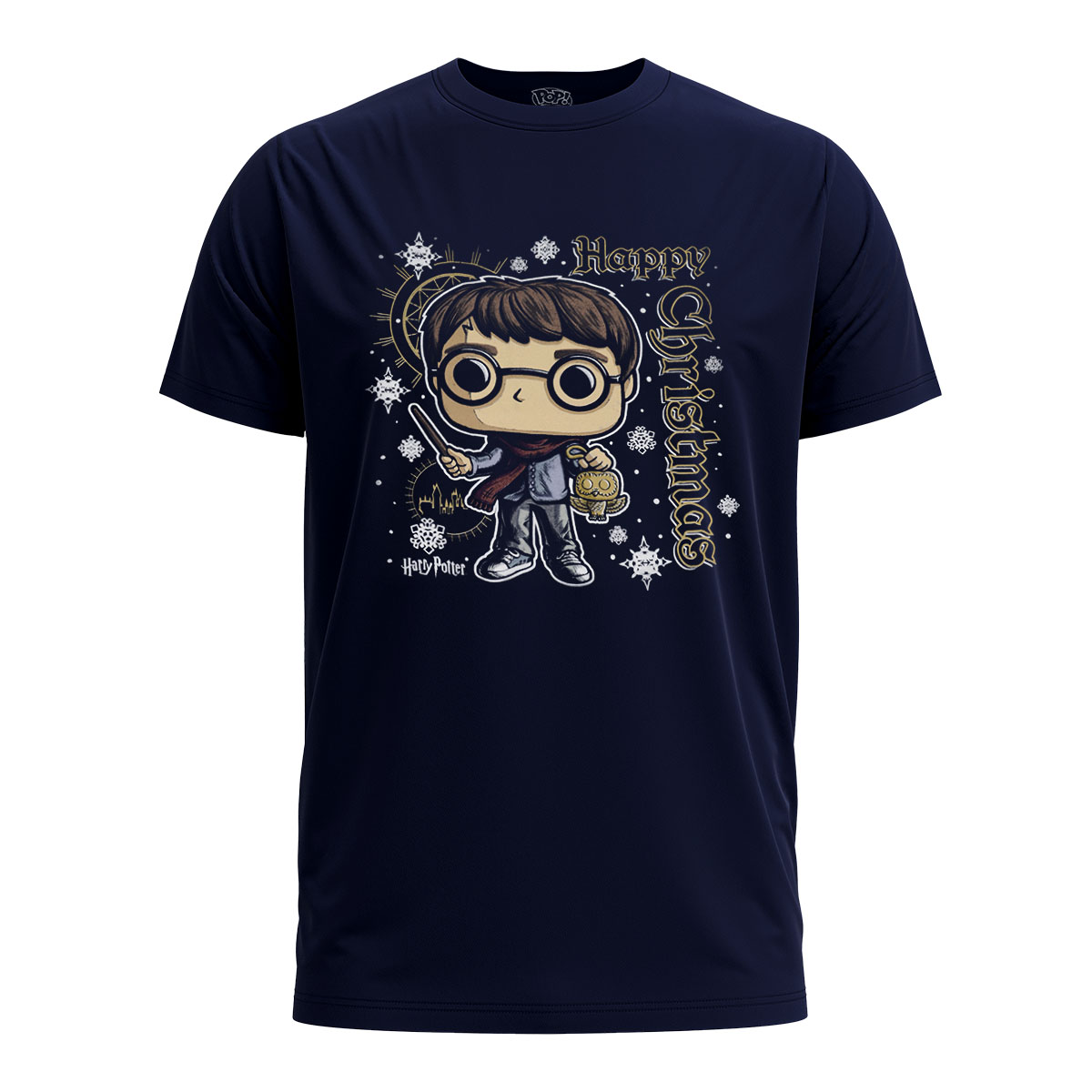 Essa camiseta é estampada com o personagem Harry Potter lançando sua magia com uma varinha em uma mão e na outra uma coruja dourada. Saudações de feriado de Hogwarts™ assumem a forma de “Feliz Natal”, em letras douradas alegres.