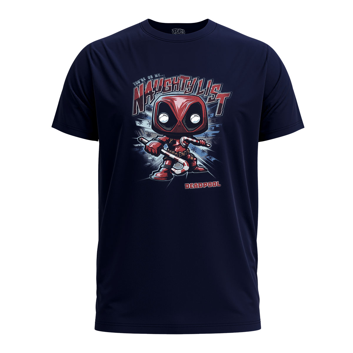 Essa camiseta é estampada com o personagem Deadpool pronto para atacar enquanto segura um conjunto de bastões de doces festivos. Com a frase “You’re on my naughty list (você está na minha lista impertinente) aparecendo acima dele